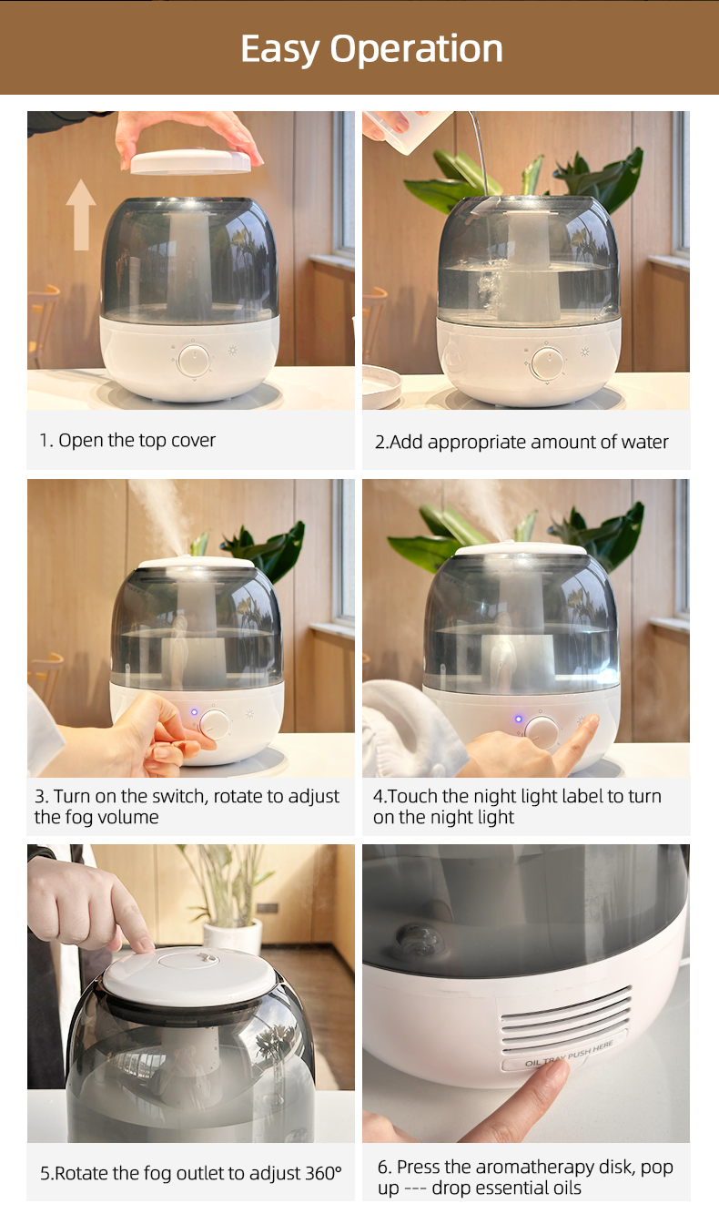 Nýi ultrasonic ilmmeðferðarrakabúnaðurinn okkar Stór 5L rafknúinn heimilishótelnotkun gerir notkun þína öruggari og innilegri. Hann er mýkri en hefðbundin rakatæki og truflar ekki nám, vinnu og hvíld. Fylling á vatnsgeymi, þægileg og fljótleg, gagnsæ vatnsgeymir, vatnshæð sést. Nanó-fín úða 300ml/klst., hámarks úða getur keyrt 8klst, lágmarks úða getur keyrt 50klst, getur bætt ilmmeðferð til að róa skapið. Rakabúnaðurinn er búinn sjálfstæðu næturljósi, þannig að nóttin þín er full af öryggi.